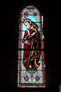 <span style="color: #993300; font-family: 'trebuchet ms', geneva, sans-serif;">13 Les fenêtres sont pourvues de vitraux réalisés par l'atelier du maître-verrier bordelais Henri Feur. Saint Christophe portant le Christ avec le monogramme d'Henri Feur. <em><strong></strong></em></span>